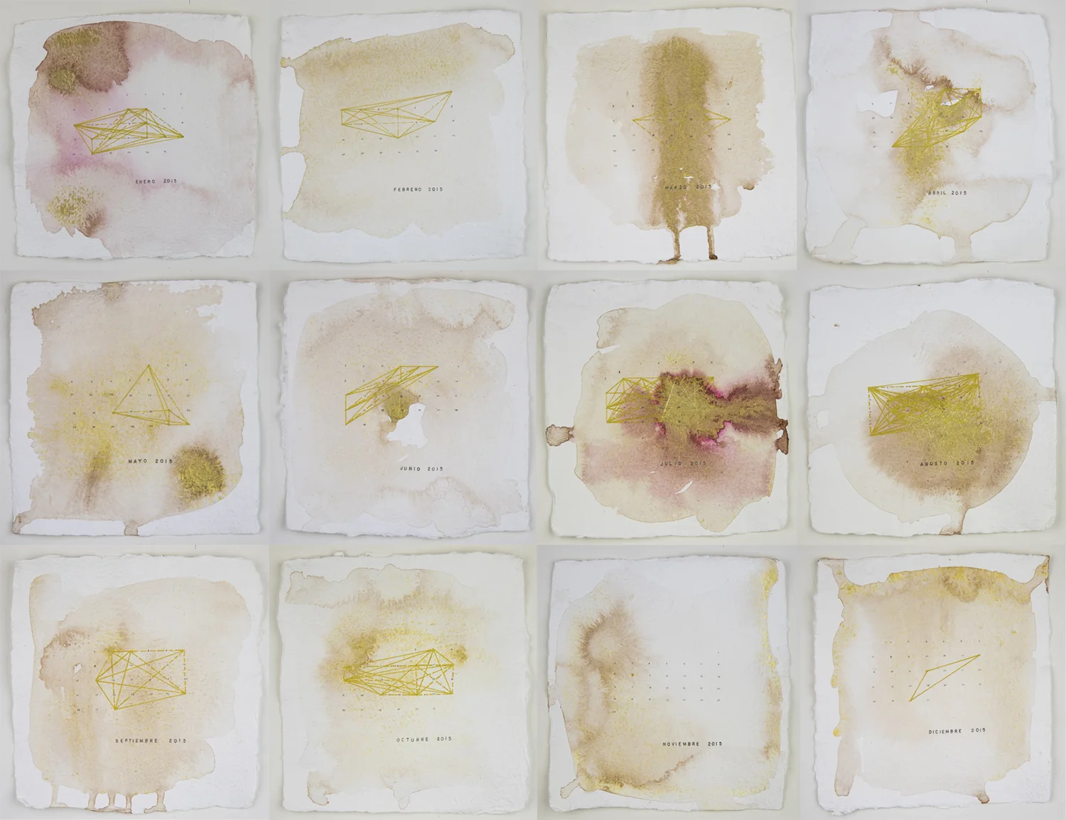 The knots of an invisible thread (Calendar 2016) polyptych of 12/ 18 x 6 in-45 x 15 cm gold powder, gold thread, graphite, on handmade paper. 2019